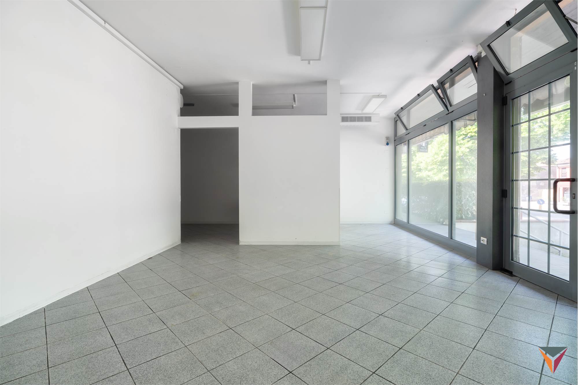 Negozio con vetrine fronte strada, e parcheggio.